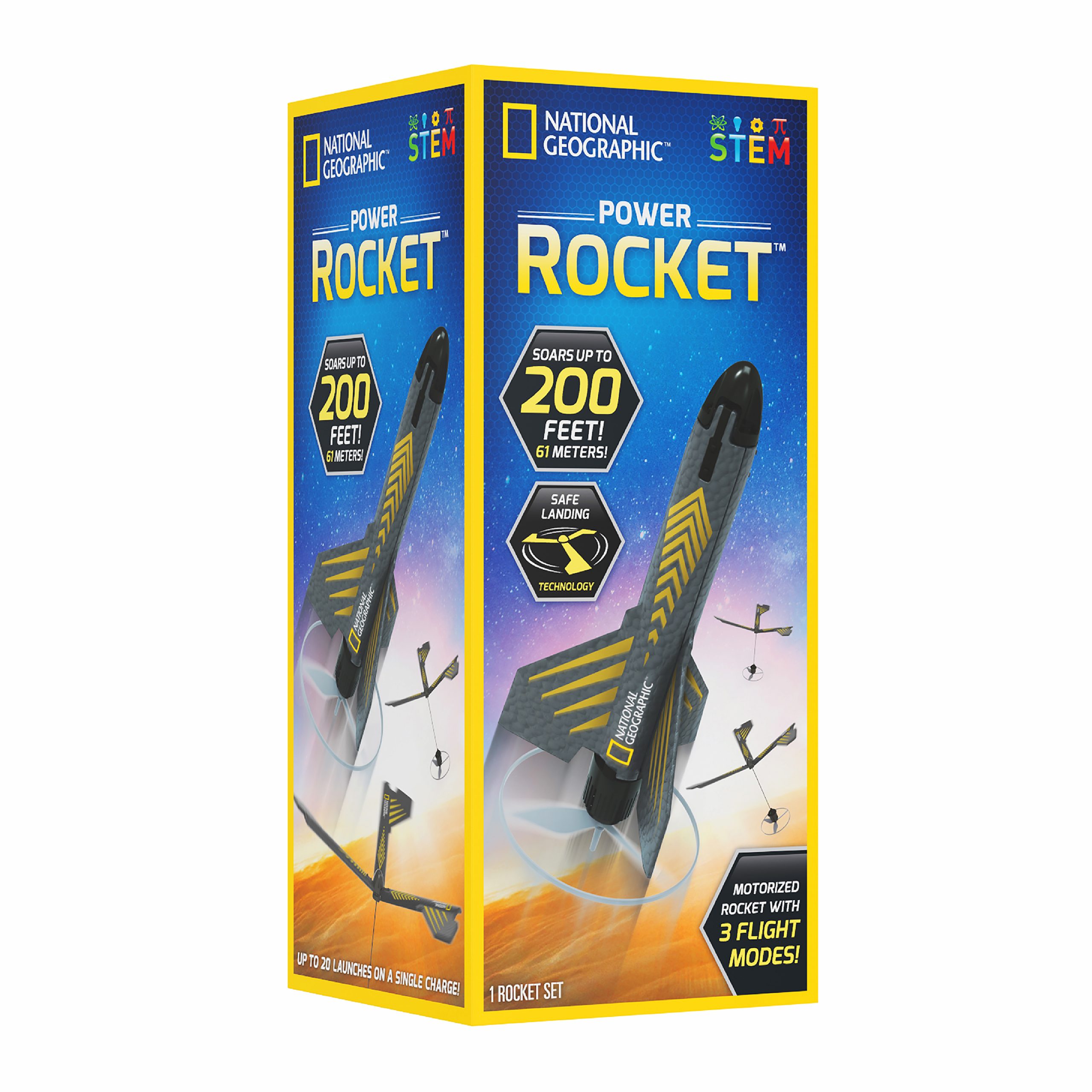 National Geographic is taking outdoor fun to heights up to 200 feet with the motorized Power Rocket, an exciting and innovative new way for kids to experience the wonder of flight! The Power Rocket is no ordinary model rocket–with its powerful electric motor, it can launch up to 200 feet in the air! Unlike a traditional stomp rocket, the Power Rocket’s electric motor is self-powered by a rechargeable lithium-ion battery, providing up to 20 launches on a single charge.