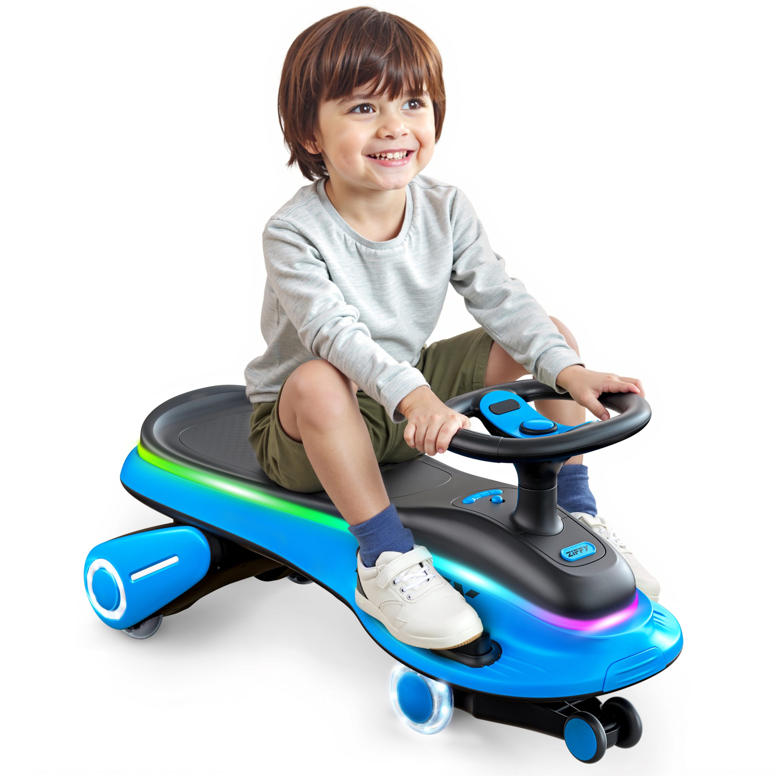 The ZIFFY Electric Wiggle Car is a ready-to-ride, no-assembly gift for kids aged 3 and up (up to 170 lbs). It delivers thrilling 360° spins, dual-speed control (2 mph/3.8 mph), vibrant LED light shows, and built-in music for an on-wheels party. A robust 45 W motor and 5.5 Ah battery power up to 120 minutes of play, while its triple-anti-rollover frame and silent, non-marking PU wheels ensure stable, floor-friendly fun.