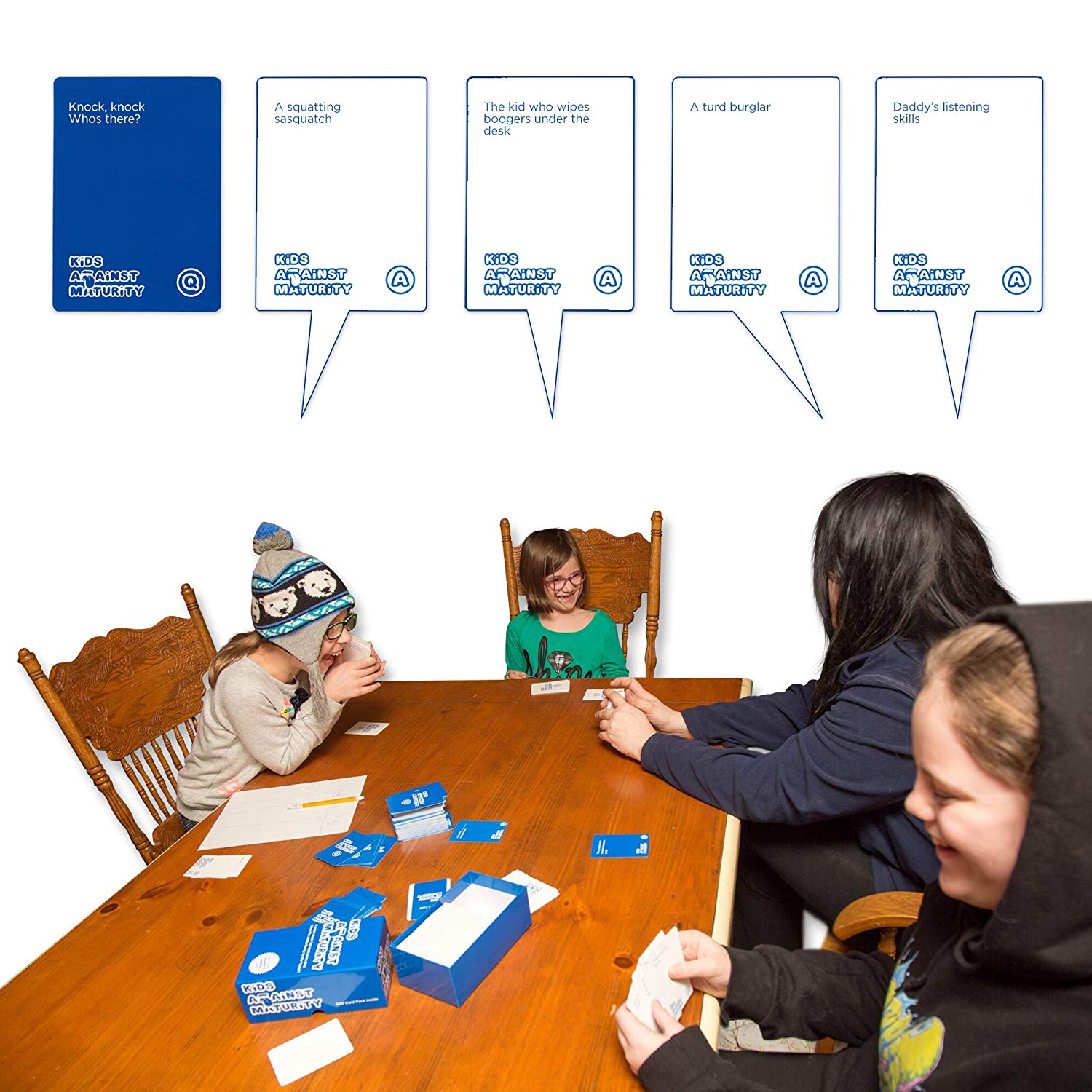 Kids Against Maturity is a fun game with lots of toilet humor for the whole family to enjoy. Poopy fart humor for the kids… and funny innuendos for the adults. A funny addition to family game night.