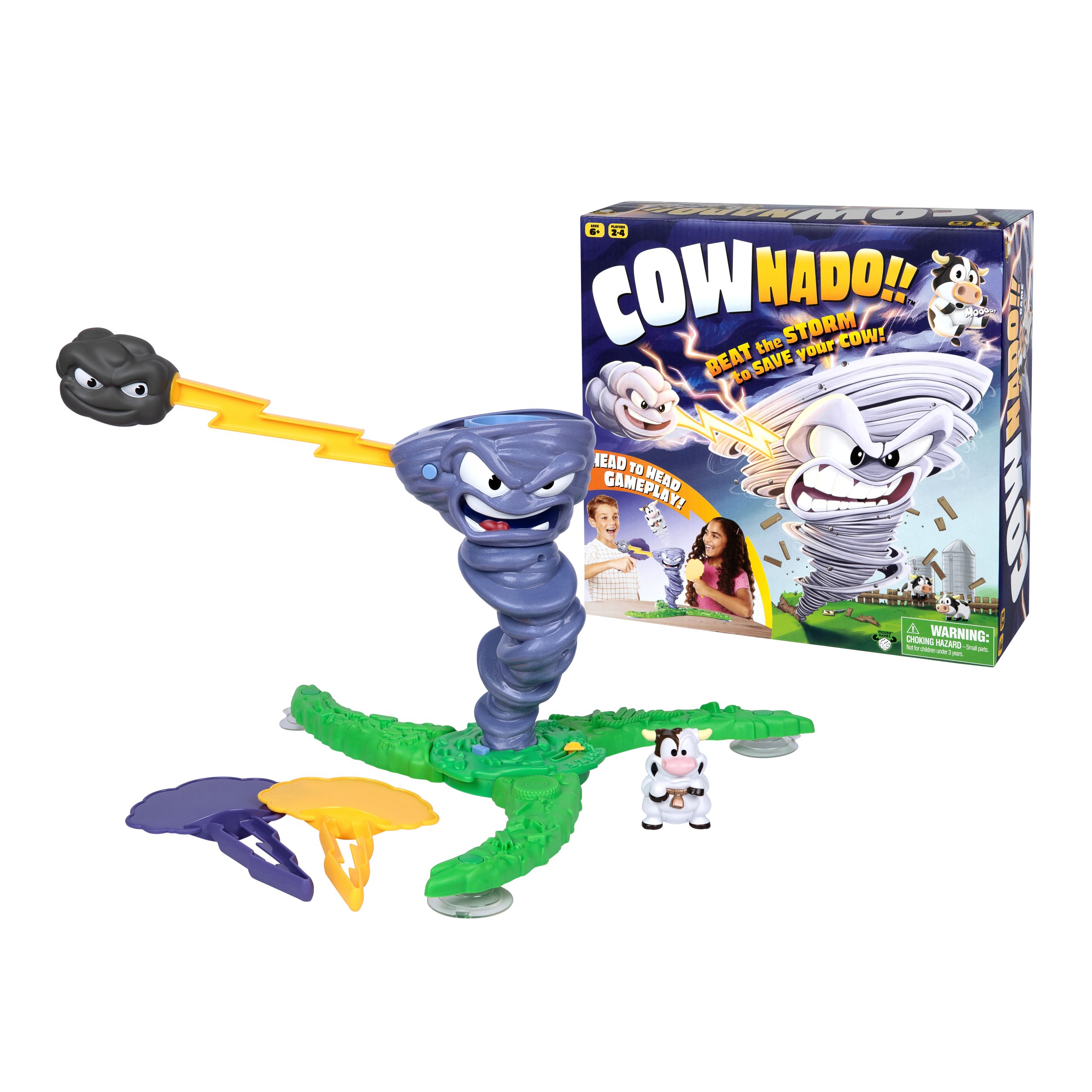 Players load the cow in a twisted tornado and then work to herd the heifer back to safety with fast, frantic storm slammin’ action with Cownado. As the two players whack the cloud back and forth – one clockwise and the other counterclockwise – the storm gains power until the cow flies out, with the arrow on top of the tornado marking who scored the point. The first player to rescue three cows wins the game.