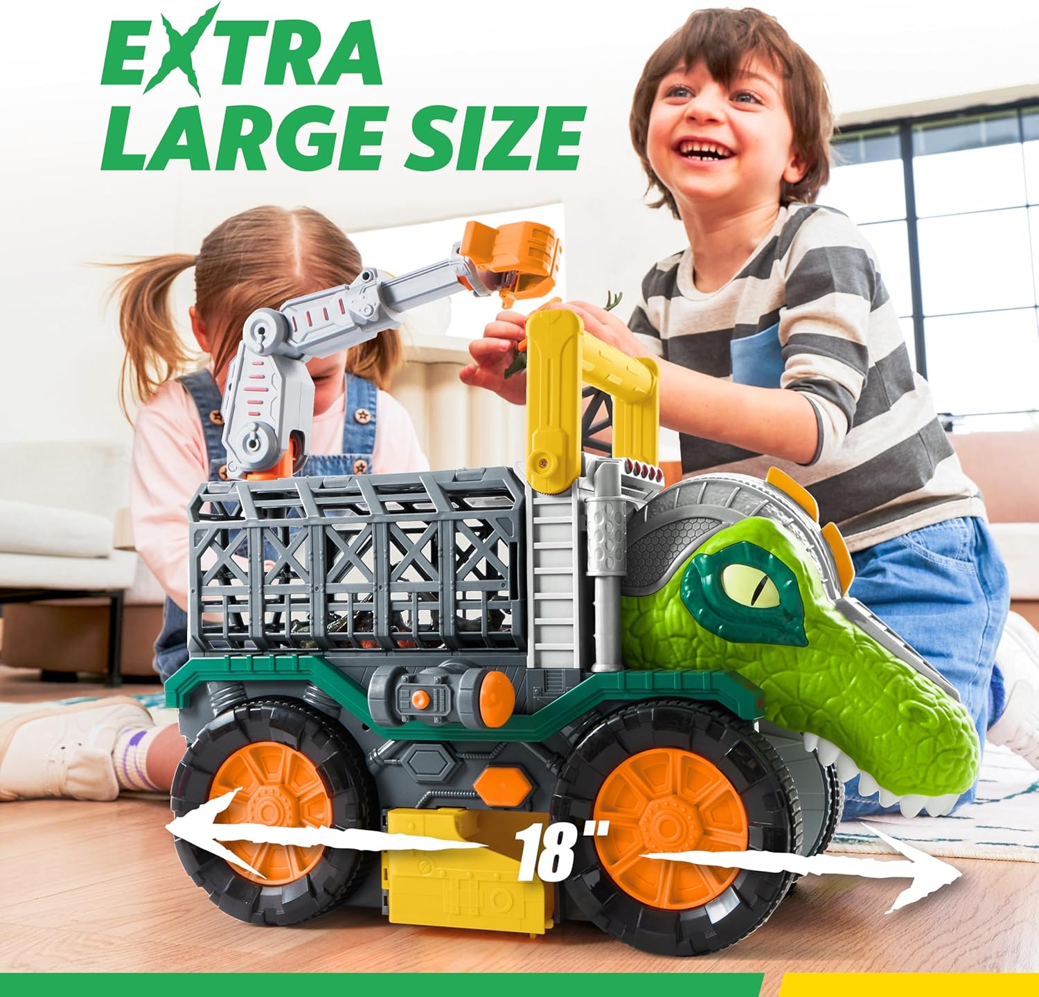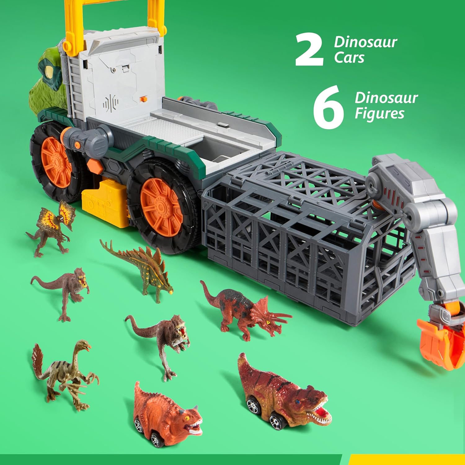 VROOMIX Big Dinosaur Truck with Small Car Set, T-Rex Truck Transport Toy with Launchers and Darts, Crane Arm & Tunnel. This extra-large rig (17.7 x 15.7 x 9.6 inches) includes 2 dinosaur cars, 4 small dinosaurs, a ferocious roaring dinosaur head, a detachable adventure cage, and a drive-through tunnel for non-stop thrills. Fire up the dual launchers for chases, grab dinosaurs with the rotating crane arm, and dive into thrilling dinosaur-hunting fun