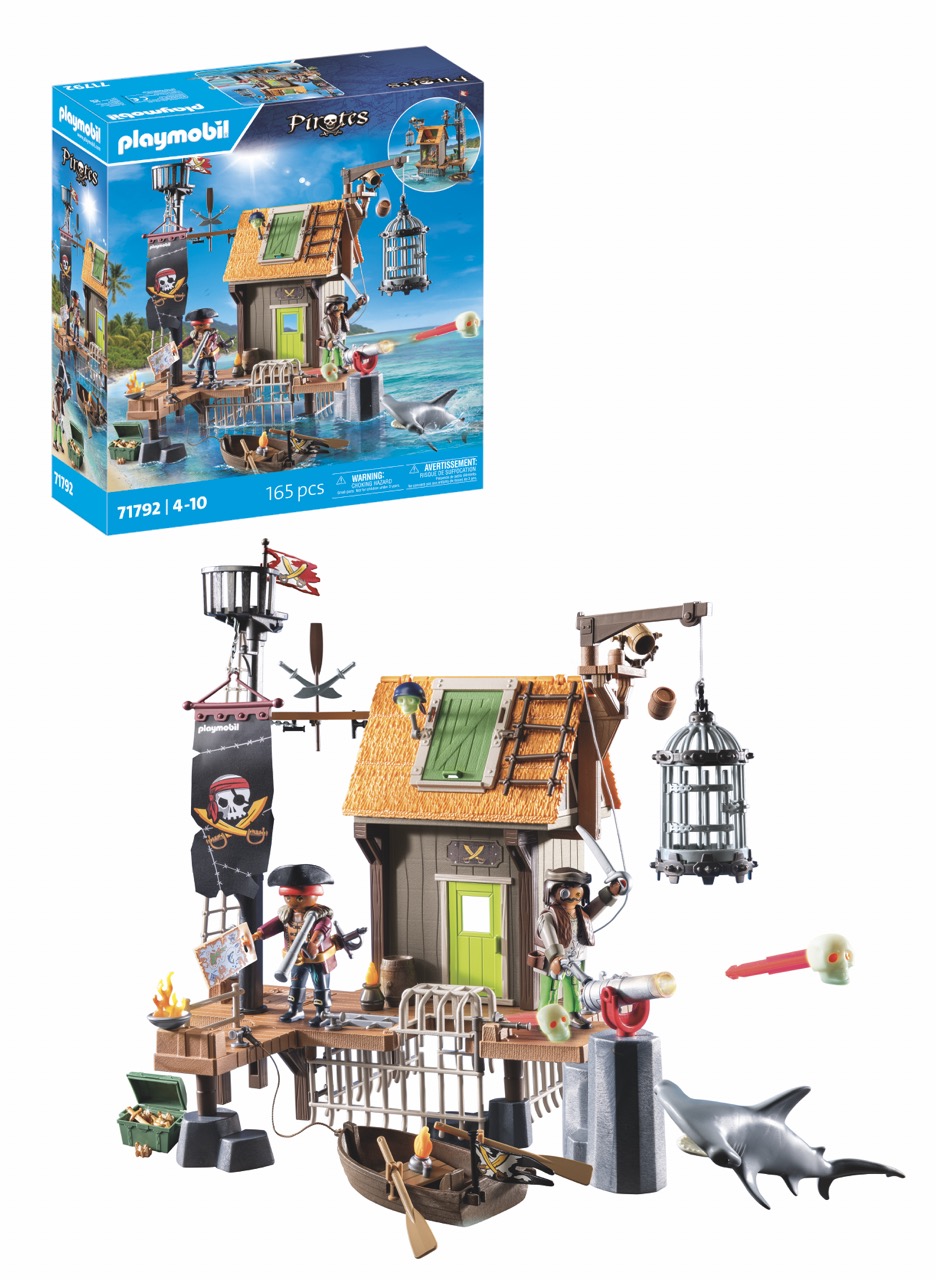 Set sail on endless escapades and play with the PLAYMOBIL Pirate Harbor, the ultimate docking station for fearless crews. Designed to spark imagination and captivate with attention to detail, this set lets kids guard treasure beneath the lookout platform, capture rival buccaneers in the sturdy cage, and fire glow-in-the-dark skull cannonballs. Navigate trapdoors, rotating barrels, and a fierce hammerhead shark for added thrills. Bring the high seas home and experience the excitement of this lively pirate hub!