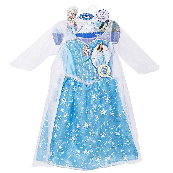 Frozen fans will love the Elsa Musical Light Up Dress with motion activated lights and song feature! The gorgeous, blue Elsa gown features snowflake glitter details, a detailed cameo and an iconic “icy look.” The Elsa dress plays 16 seconds of the Idina Menzel, Academy Award Winning song, “Let It Go!” that girls love to sing along to! Anna dress is also available and plays “For the First Time in Forever.”