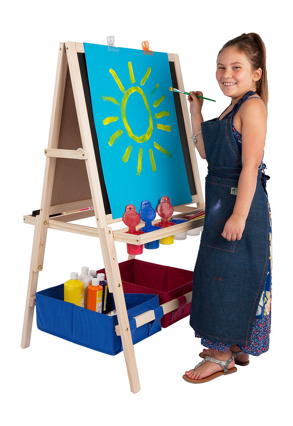 An inspiring multi-use kids art easel with storage bins that will grow with your child! Solid hardwood kids easel is sturdy and stable. Adjusts from 46 to 54 high. Chalk board side and dry erase side each measure 23-1/4×23-1/4. Six 150ml lidded paint cups fit into the front easel tray.