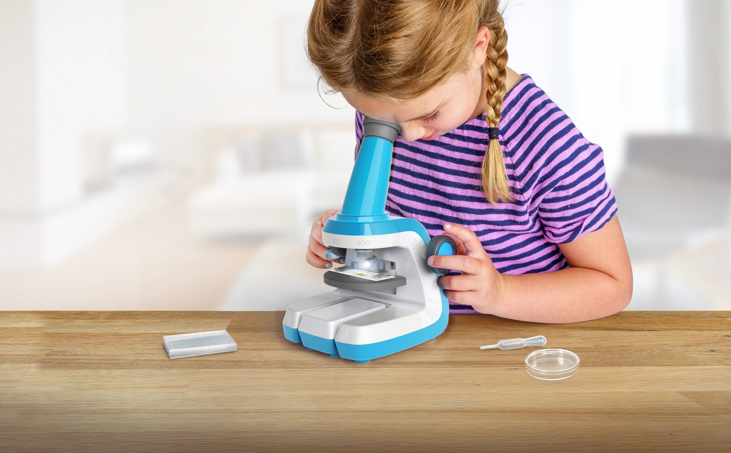 Kids will love this National Geographic Microscope Science Lab designed just for them. We studied what worked with other microscopes and what didn’t, and developed one of the easiest microscopes for kids to use. The soft-touch eyepiece is gentle on skin and the large focus knobs are easy for little hands to turn. When focusing, the slide platform moves up and down to help keep the entire microscope more stable and to ensure the specimen remains in the perfect viewing position. The slide storage case integrates into the base of the microscope and a wide-footed base helps keep the microscope firmly in place. Kids can choose from 40x, 100x, or 400x magnification by moving the adjustment lever, and they can switch between an upper light and lower light with the flip of a switch on the back.
