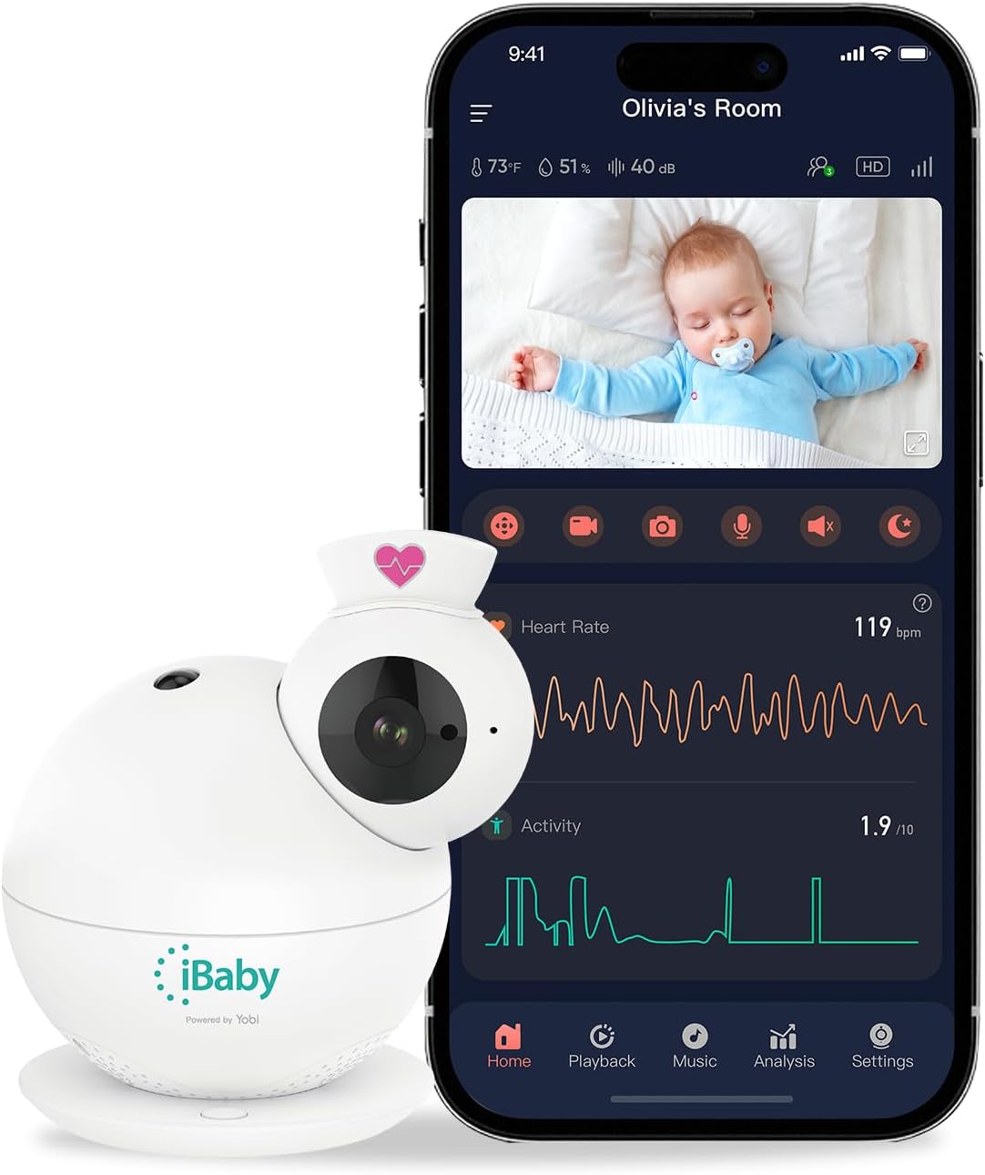 iBaby i8 is a Smart Baby Monitor that tracks breathing, heart rate, and sleep without wearables. It features 1080P HD video, 360° pan/tilt, cry alerts, temperature and humidity sensors, and two-way talk. No subscription required. Includes 32GB local storage and app-based access for multiple caregivers.