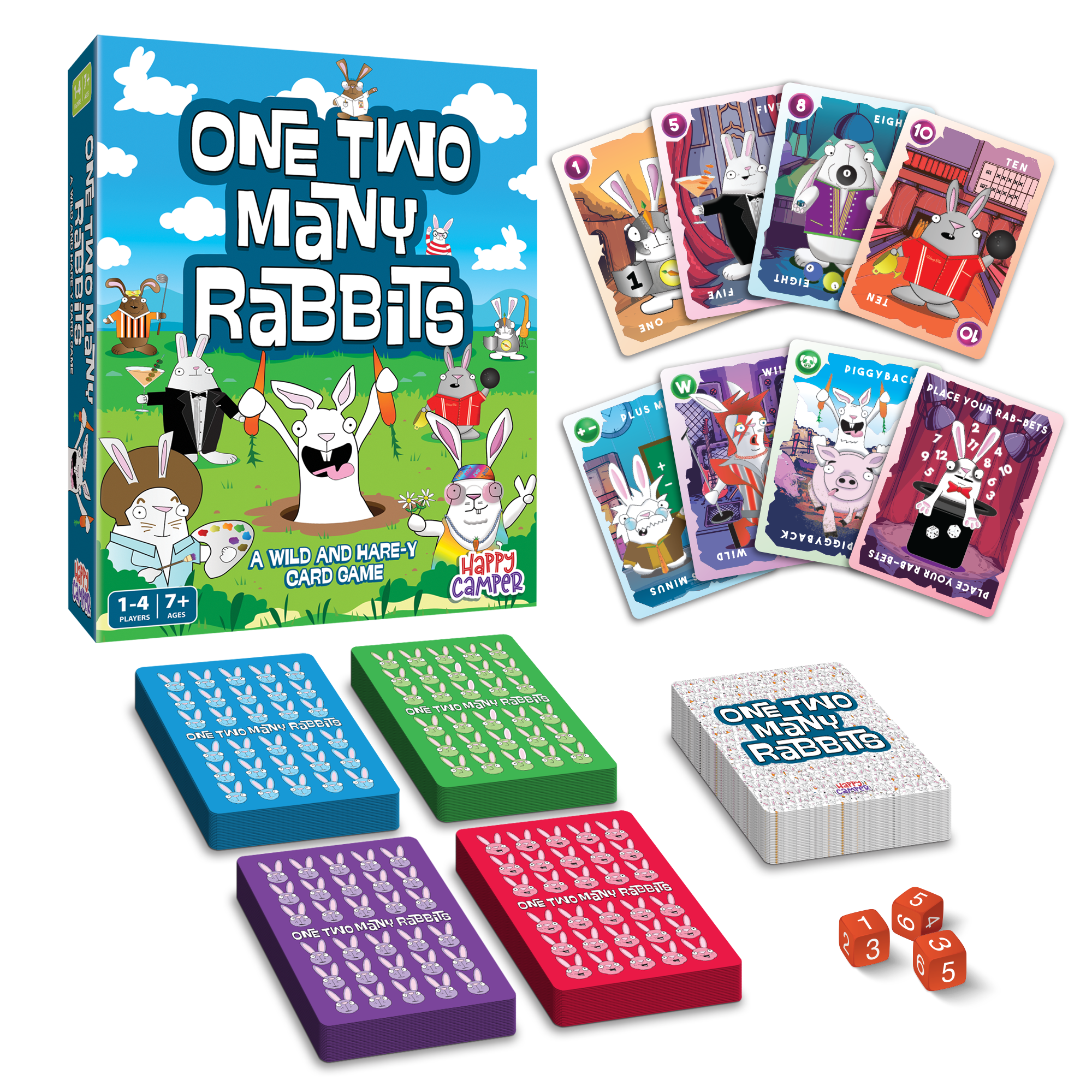 In One Two Many Rabbits the rabbits of Wiggins Farm have been running rampant for far too long. It’s up to you to round them up and toss them back into their rabbit hole! Roll one, two, or three dice and then combine the numbers to discard rabbit cards that match the outcome. But watch out! These varmints will find all kinds of ways to hop back into your hand. Be the first player to get rid of all of your rabbits and win by a hare!