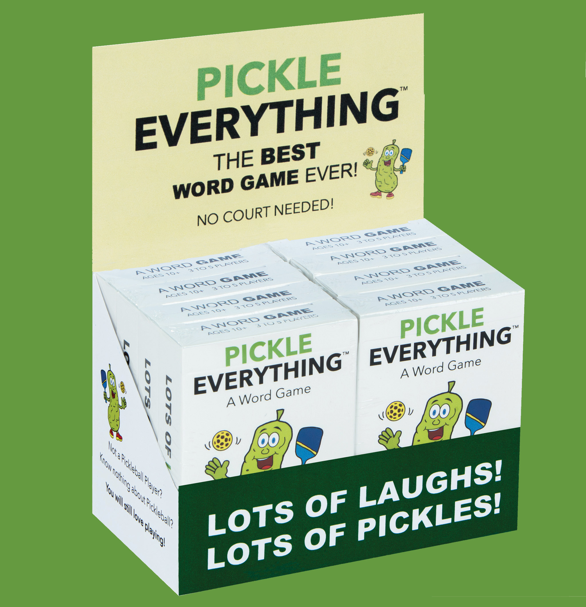 Pickle Everything is a card game where words meet fun and pickles rule! Ages 10 and up can enjoy this unique, fast-paced, hilarious game as they race to beat other players and answer the clues. With 52 cards, this game is perfect for families, parties, and more. There are multiple ways to play! After all the cards have been read, each clue can only be given using 1 word. Round 3? Charades all the way!