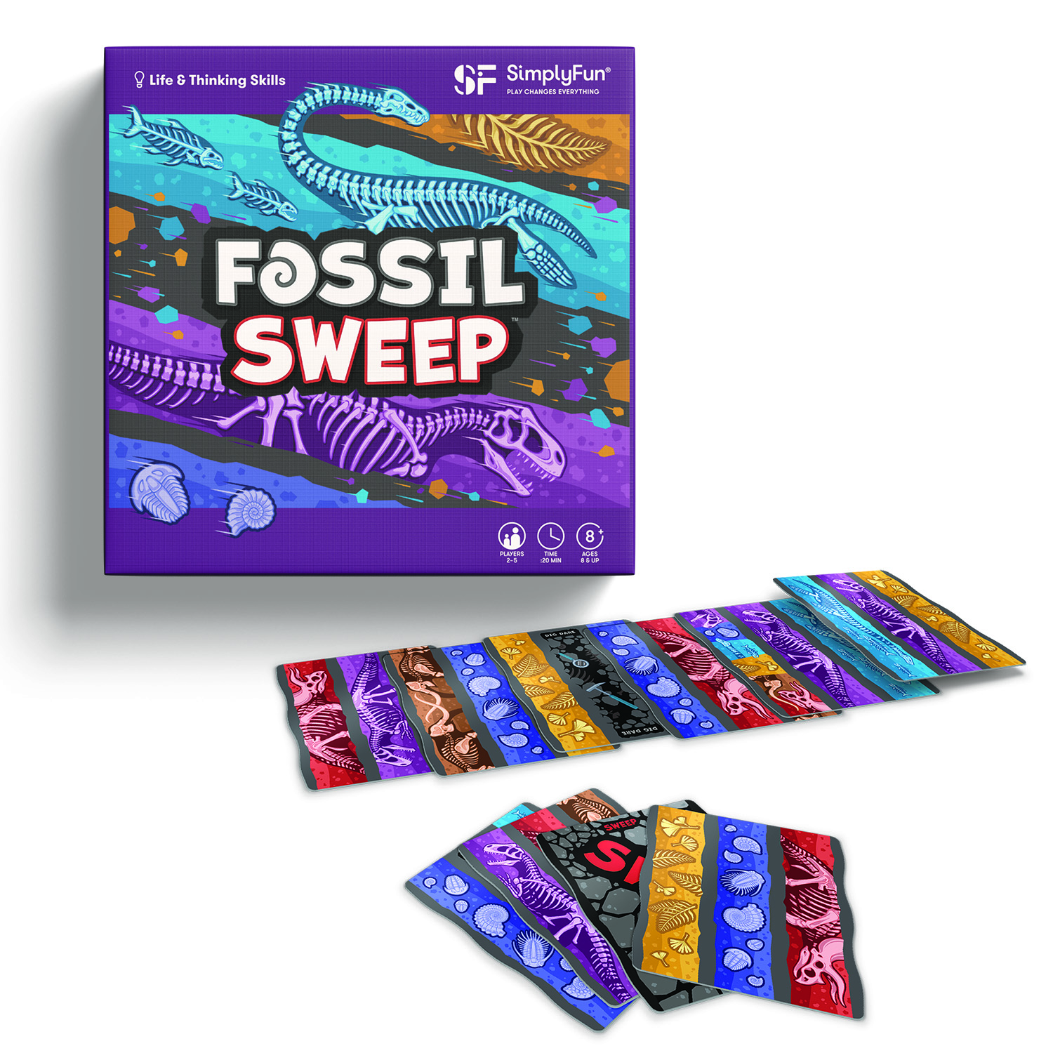 Step into the fascinating world of fossils with Fossil Sweep—from hardened animal bones to intricate plant imprints. Fossils don’t exist forever though, see how many you can discover before they become lost. Use strategy and decision-making to match fossil layers on the cards in your hand to the card layers on the dig site. Get rid of as many cards in your hand as you can before someone plays a “Sweep” card.