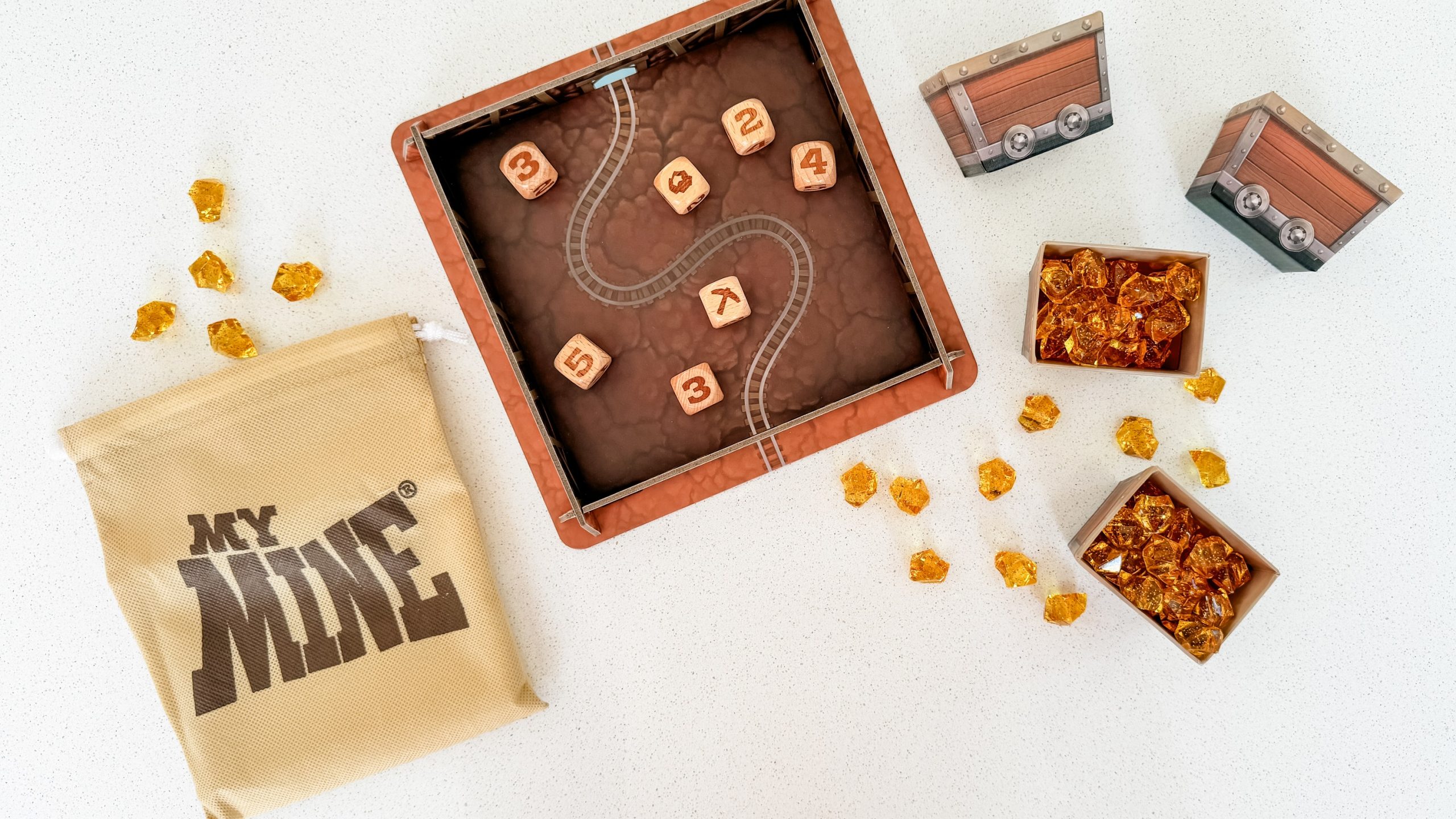 Eureka, you have struck gold! My Mine is loaded with valuable gold nuggets and ready for you to stake your claim! Try to mine as many nuggets as you can, but beware—the other miners will also be trying to stake their claim and may even try to take some of yours. In this game of risk and reward, players roll the dice and try to collect as many gold nuggets as they can. But if you get too greedy, you may lose it all.