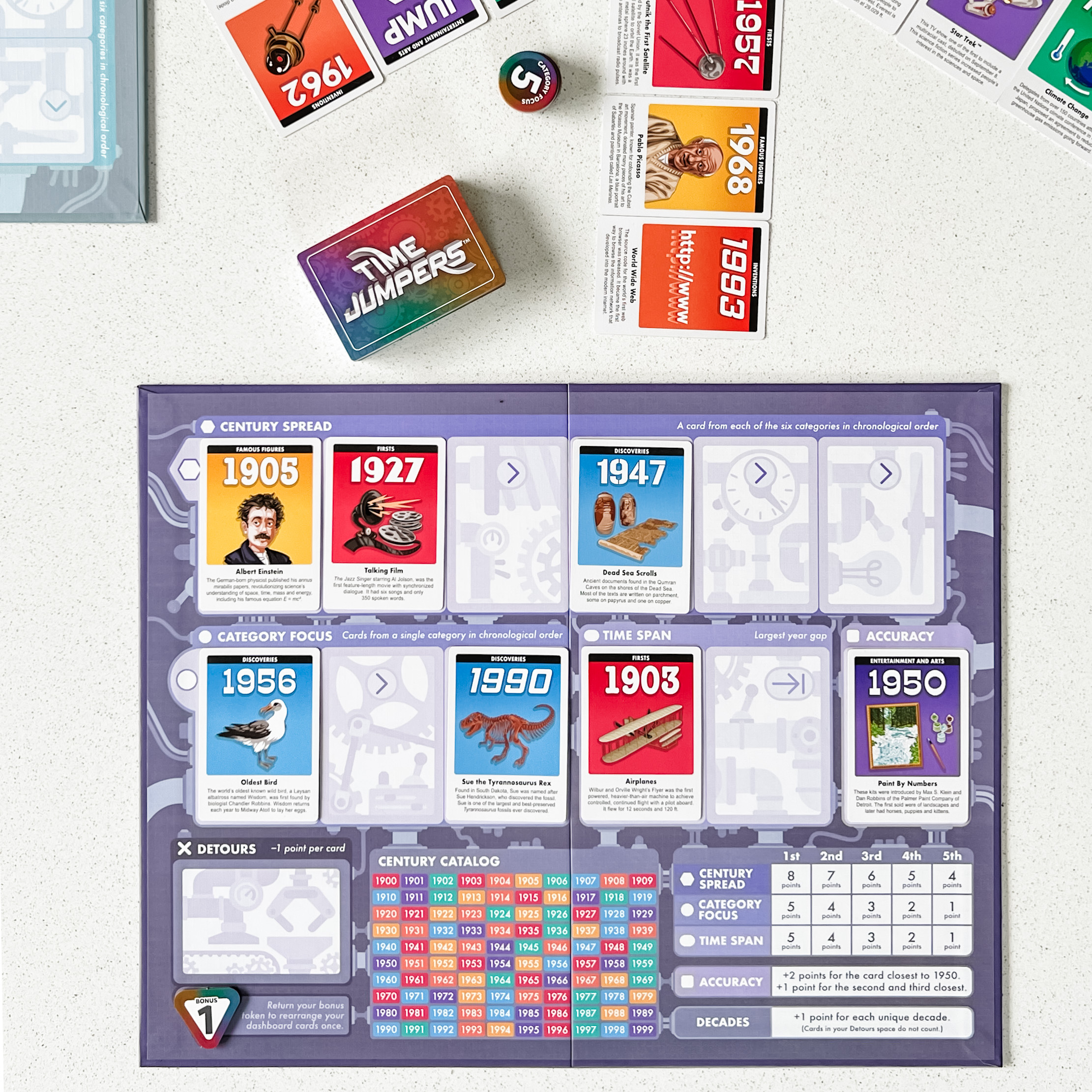 Go back in time with Time Jumpers to witness some of the greatest achievements, discoveries, and events of the 20th century. In this game, players take turns moving around the category portal to collect cards and fill their dashboards with cards in chronological order to meet certain goals like collecting a card from each category. Players earn points based on each goal and the player with the most points at the end of the game wins!
