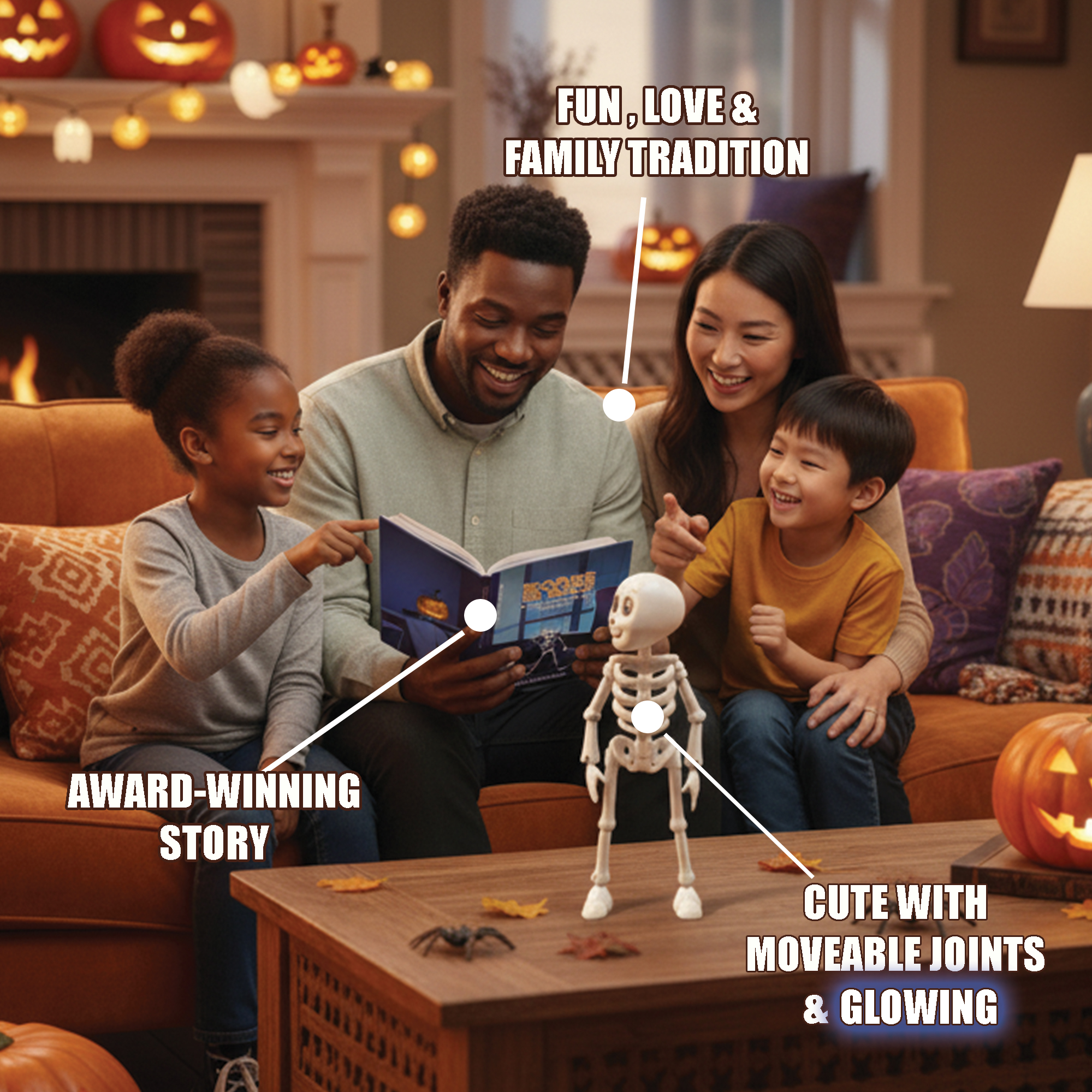 Bones is Back is an award-winning Halloween book and toy set that celebrates creativity, kindness, and family connection. It includes a beautifully illustrated storybook and a glow-in-the-dark very cute skeleton figure with snap-fit joints for endless play and imaginative storytelling. Designed by a family for all families to make Halloween fun and meaningful. Bones helps children see beyond candy and costumes—encouraging positive behavior and creating memories.