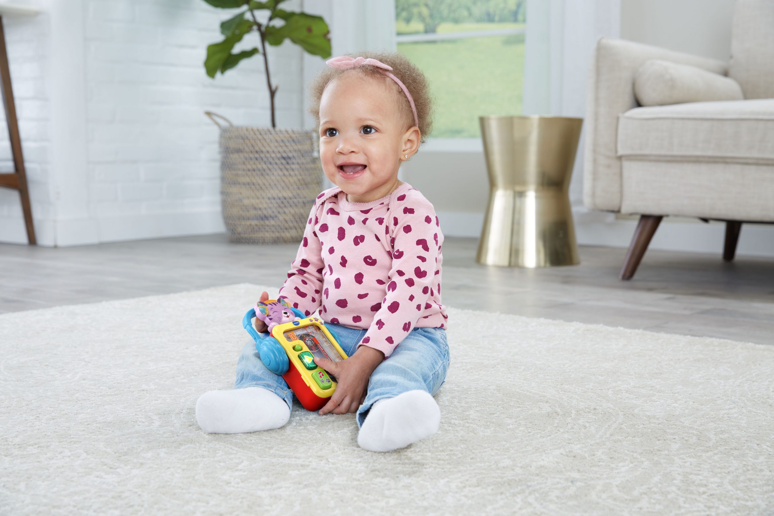 Turn back the clock and turn up the tunes with this retro musical toy, the VTech® Kiddie Cat Cassette Player™. Bop to the music along with this head-bobbin’ kitty to jazz, country and rock-n-roll style melodies and the Alphabet Song. This take-along music toy may remind you of a small, iconic portable tape deck, but this lil’ player doesn’t need cassettes to play music. The wheels do spin, which babies and toddlers will love to watch. As they press the buttons, kiddos can learn how their actions make the kitty bop up and down and side to side. Chill out with some musical moves and totally tubular tunes!