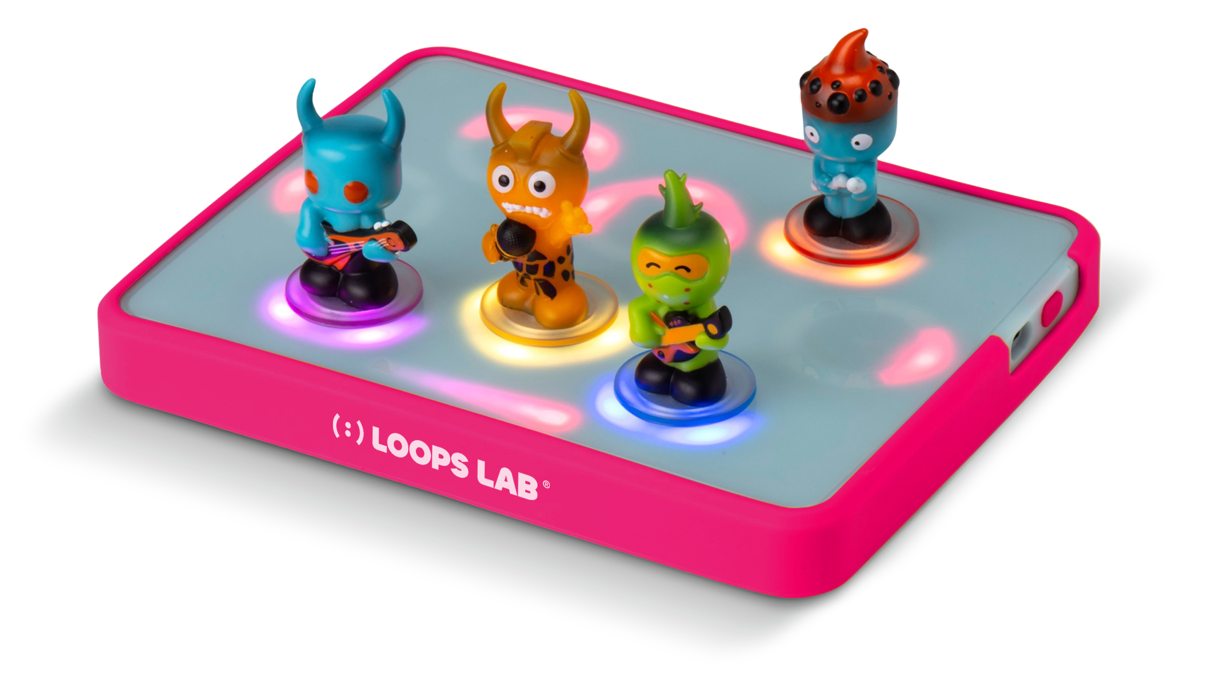 “You get a Loops Lab Stage which has these circles that are magnetic. It is lightweight and comes with a bright pink bumper to wrap around it. We also get two bands which each consist of 5 members. Each member of the band plays a different instrument or sound. The bandmates have magnets on their bases which stick to the circles on the Loops Lab Stage. The magnets stick well, and the bandmates are all very interesting.”